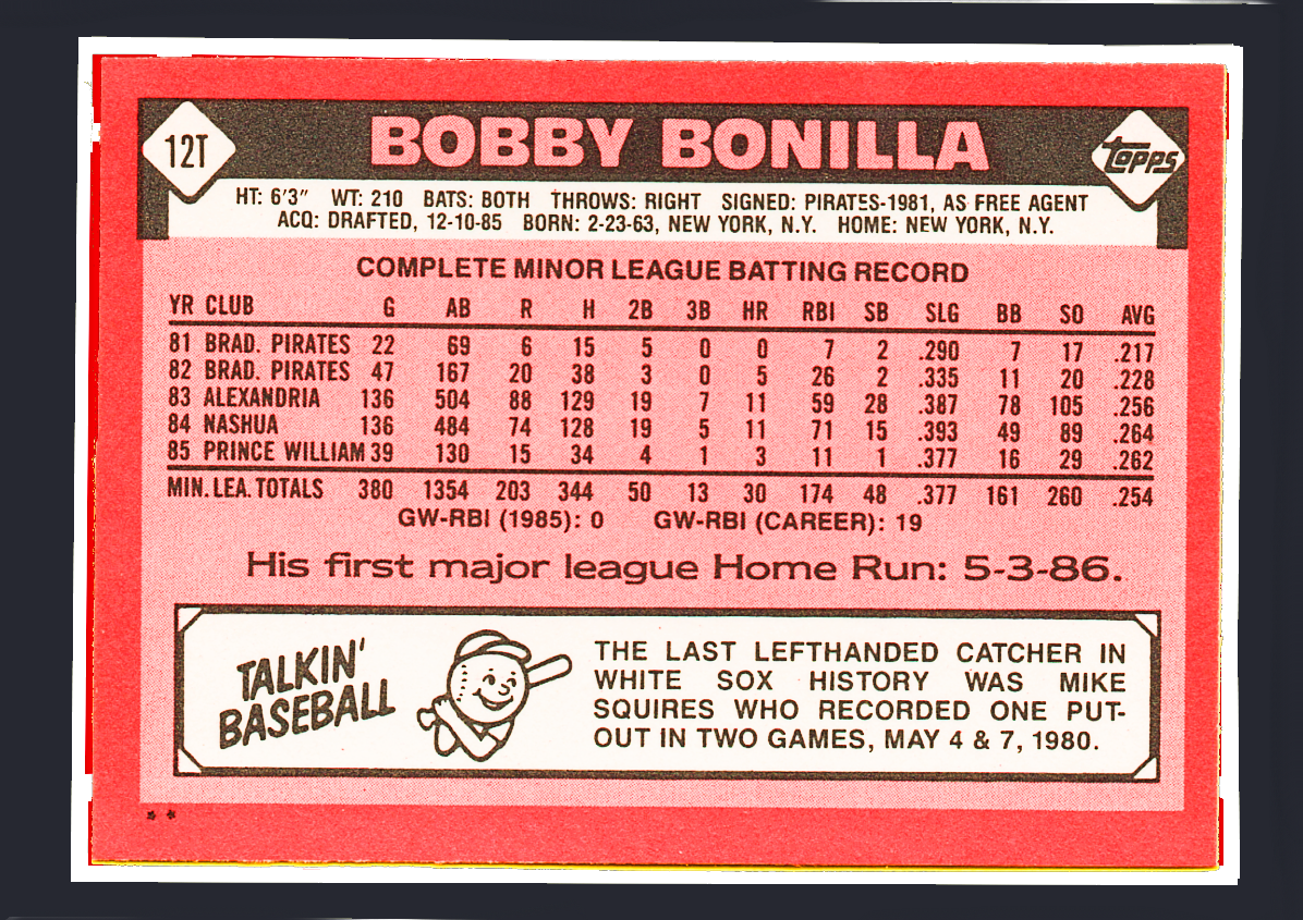 1986 Topps Traded #121T Bobby Bonilla Rookie Card (RC) – Chicago White Sox