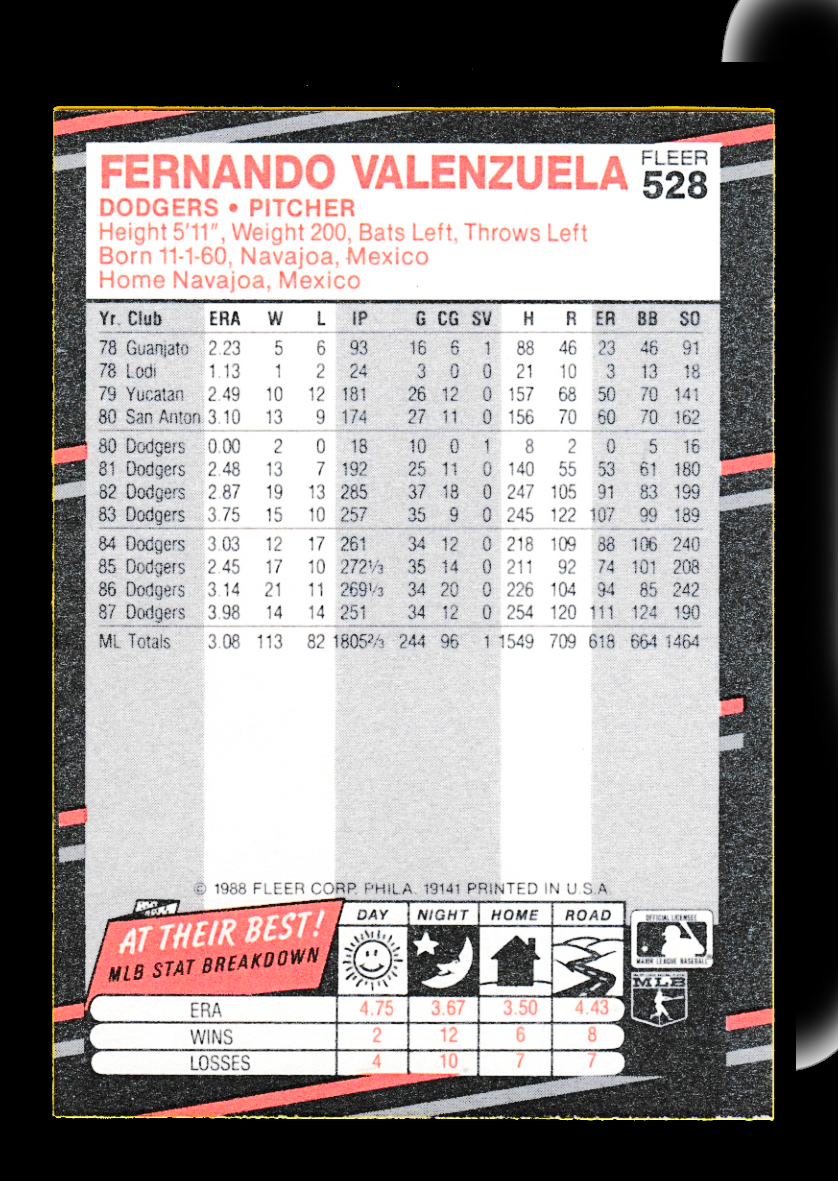1988 Fleer #528 Fernando Valenzuela – Los Angeles Dodgers