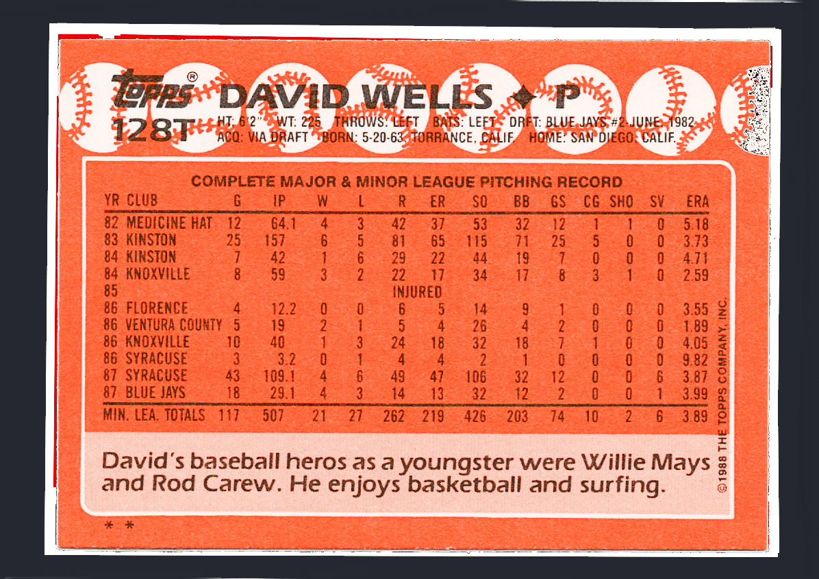 1988 Topps Traded #128T David Wells Rookie Card (RC) – Toronto Blue Jays