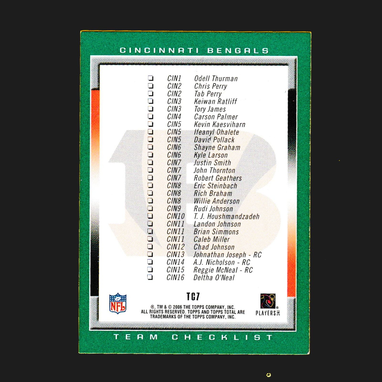 2006 Topps TC7 Carson Palmer – Quarterback Cincinnati Bengals