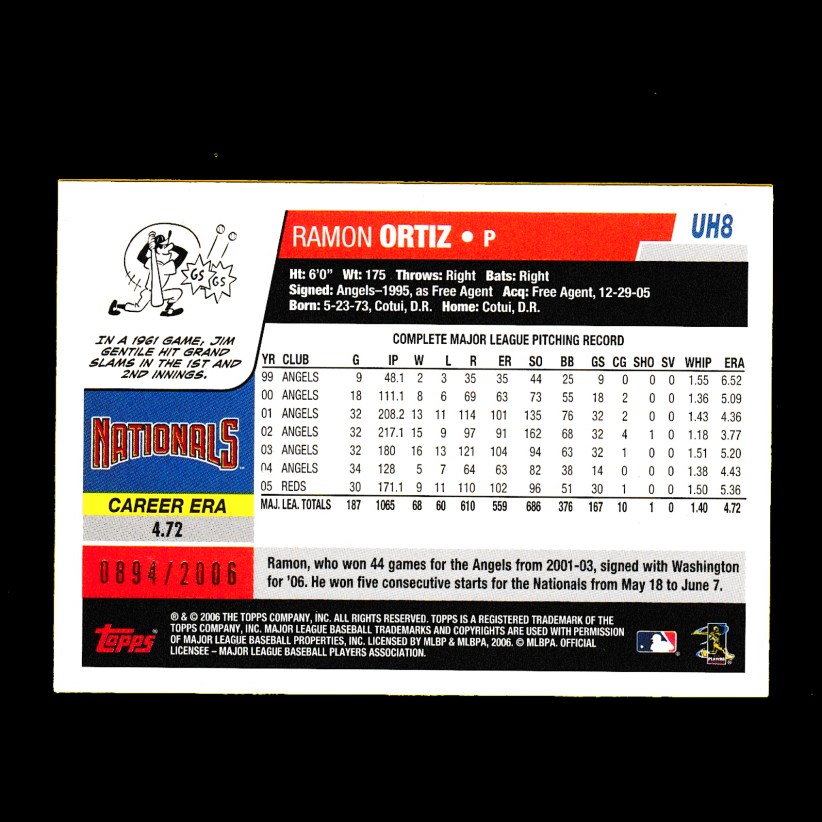 2006 Topps Update #UH8 Ramon Ortiz – Gold Parallel (#894/2006) – Nationals