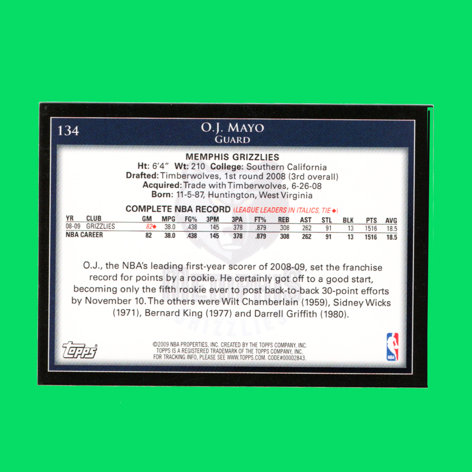 2009-10 Topps – #134 O.J. Mayo Rookie – Grizzlies