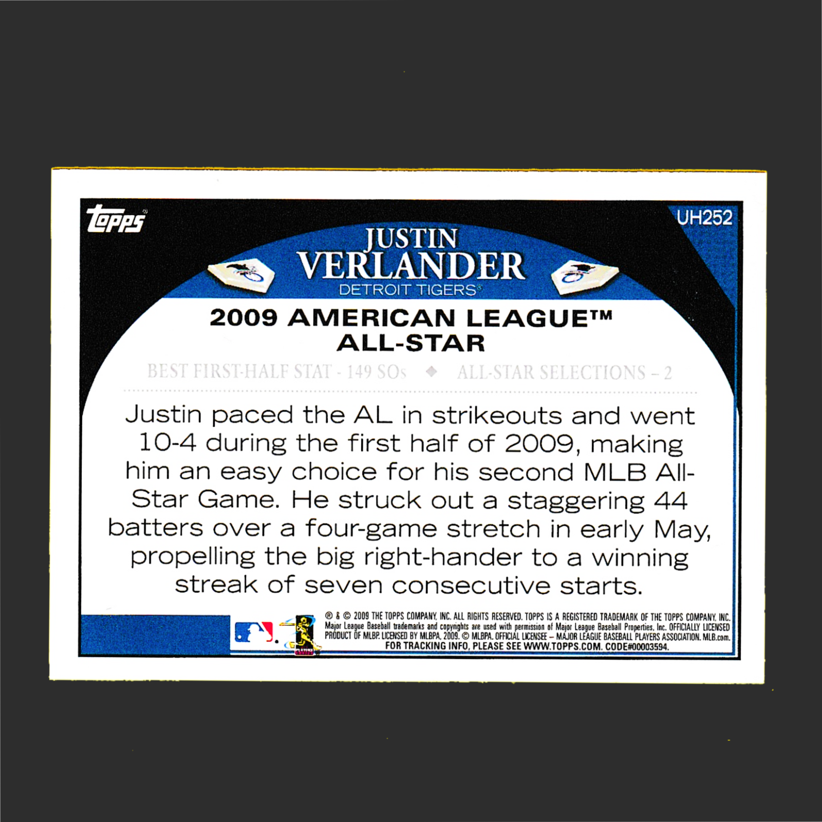 2009 Topps UH252 Justin Verlander MLB All Stars – Detroit Tigers