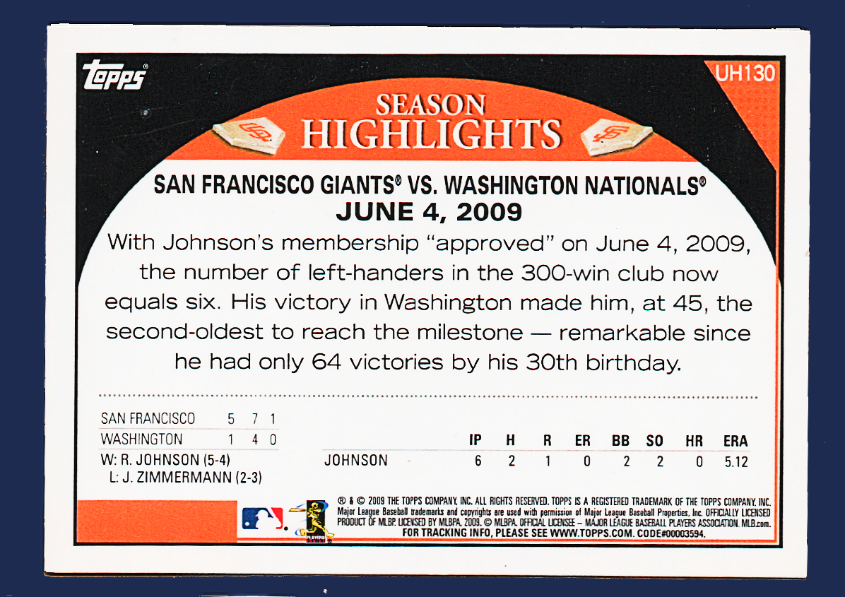 2009 Topps Update UH130 – Randy Johnson’s ‘Milestone 300th Win’ – SF Giants