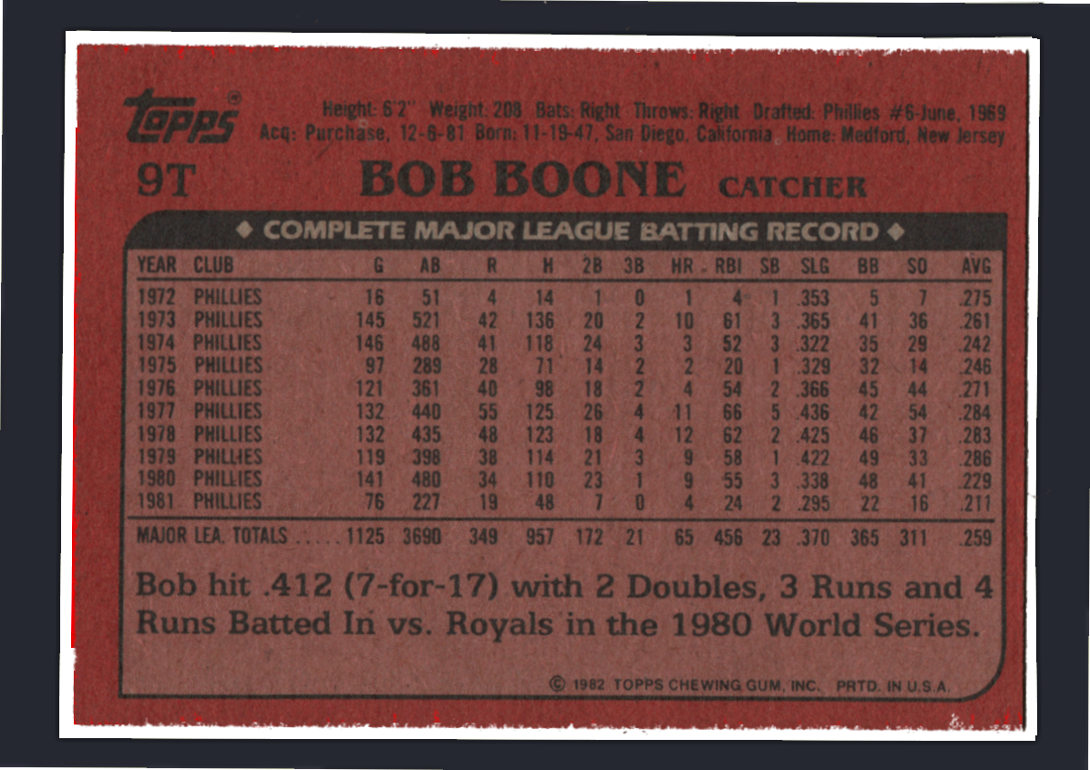 Vintage 1982 Topps Traded #9T Bob Boone – Catcher California Angels