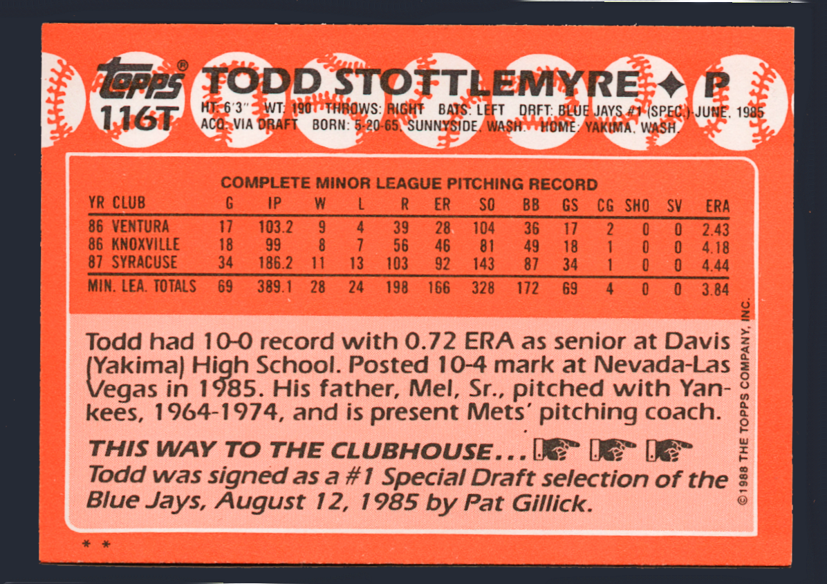Vintage 1986 Topps Traded #116T – Todd Stottlemyre Rookie Card (RC) – Blue Jays